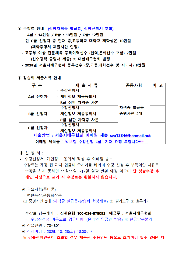 수강료 납부계좌 : 신한은행 100-036-878092 예금주 : 서울시배구협회