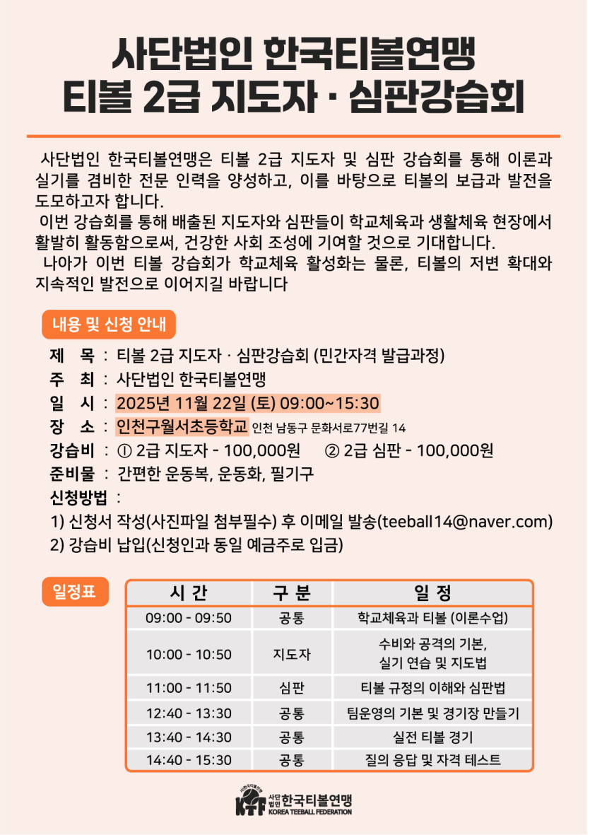 강습회 2025년 티볼 2급 지도자 및 심판 자격연수(인천구월서초등학교, 11월 22일)