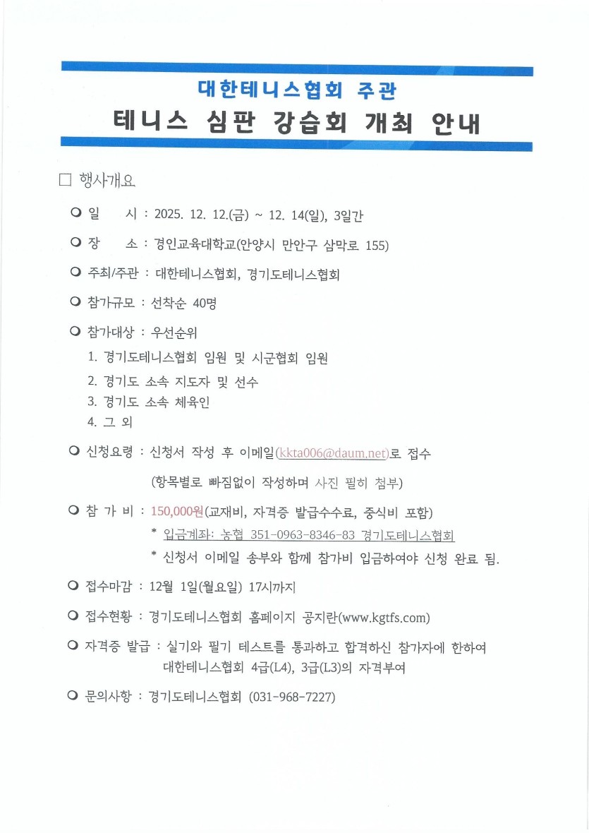 - 다음글2025년 제3차 국가심판강습회 개최 안내 ※참가 신청기한: 2025. 12. 2.(화) 18:00까지 25.11.24
