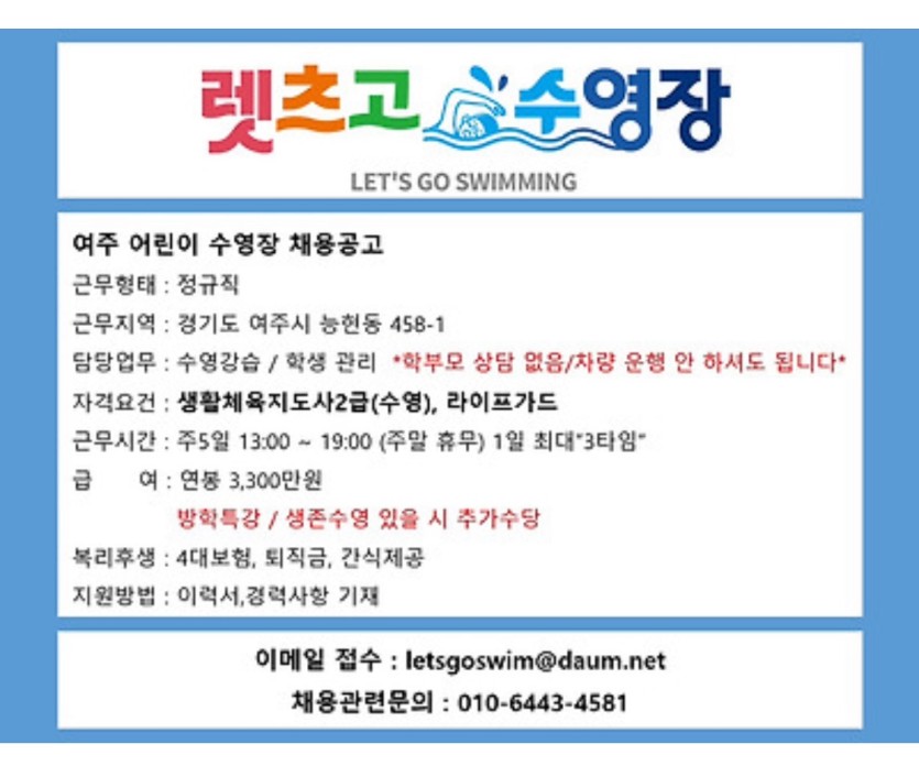 급여조건 : 연봉 3,300만원 (방학특강/생존수영 있을시 추가수당)