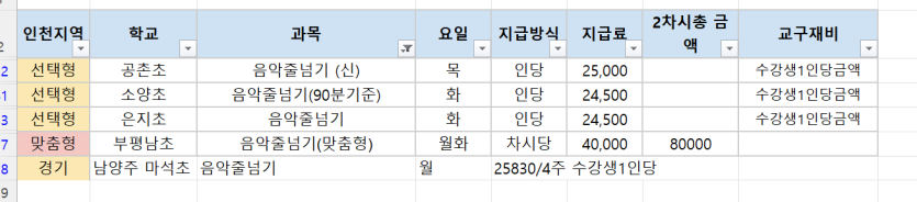 근무장소,요일,금액: 남양주 마석초-월,1인당 25830,인천공촌초-화.40분2차시 72000원 ,인천소양초-1인당24500원,인천은지초-화,1인당24500원